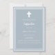 Dunkelblauer Hintergrund, mit weißem Rahmen dekoriert, weißes Kreuz Persönlich und fügen Sie den Namen und die Details. Weißer Text.