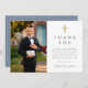 Personalisiertes Dusty Blue Boy First Communion Cross Foto Danke Karte. Dusty Blue Script Cross Boy First Communion Suite mit passendem Zubehör für Schreibwaren und Party erhältlich.