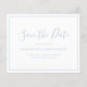 Einfache Budget staubblaue Hochzeit Speichern Sie das Datum mit "Save the Date" in einem eleganten handgeschriebenen Skript zusammen mit Ihren Details, umgeben von einer dünnen Grenze. Das klassische, traditionelle Layout ohne Fotos macht dieses Non-Foto Save the Date zu einem idealen Ort für eine Hochzeit.