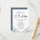 Eine staubige blaue Detailkarte mit schlichten, eleganten, blauen Damast-Schriftzügen und Kalligrafiedetails. Die Details-Karte des Gehäuses enthielt eine individuell anpassbare Zeitleiste mit Cocktailbrille, Silbergeschirr zum Abendessen, einen Tanzschuh und ein altmodisches Auto für Goodnight. Diese Vorlage kann Hochzeitsdetails und Hochzeitsinformationen wie Unterkunft und Hochzeitswebsite enthalten.