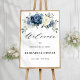 Dusty blauen Probe Abendessen Begrüßung Poster mit elegantem Bouquet von marineblau, königsblau , weiß , gold, Champagner Elfenbein, rot Farbe Rose , ranunculus Blume Knospen und Salbei grün Eukalyptus Blätter und elegantes Aquarellbouquet. Bitte kontaktieren Sie mich für Hilfe bei der Anpassung oder wenn Sie ein anderes Produkt mit diesem Design benötigen.