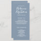 Schöne Typografie Hochzeitsprogramme können Sie anpassen. Dunkelblauer Hintergrund mit weißem Text. Design von Elke Clarke © Verfügbar unter www.zazzle.com/monogramgallery. Fügen Sie alle Ihre persönlichen Daten hinzu, um ein einfaches, aber anspruchsvolles Programm zu erstellen, das Ihre Saaldiener ausgeben können, wenn Ihre Gäste in die Kirche eintreten oder sich dort niederlassen, wo die Zeremonie stattfinden wird. Es hilft den Leuten, während der Zeremonie mitzumachen, aber auch als Pfand für Ihre Gäste. Sie können die Vorlagenfelder verwenden, um die vorgeschlagenen Informationen über Ihre Hochzeitsfeier und die Reihenfolge des Dienstes auszufüllen und Ihnen zu danken, oder wählen Sie "Anpassen" und verwenden Sie das Bearbeitungsmenü, um den Textabstand, die Schriftart, die Farben zu ändern, wie Sie Ihre eigenen Hochzeitsprogramme erstellen möchten.
