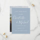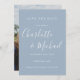 Diese elegante, staubblaue Save the Date-Karte mit ihren charakteristischen Stilnamen kann mit Ihren besonderen Hochzeitstag-Informationen in schicker Typografie und Ihrem besonderen Foto auf der Rückseite personalisiert werden. Entwickelt von Thisisnotme©