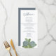 Ein elegantes, staubblaues Hydrangea Blumenstrauß botanisches Grün elegantes Dinner Menu. Eine wunderbare Ergänzung zu Ihrem Hochzeitsempfang. Lass deinen Gästen, was auf der Speisekarte steht, mit einem eleganten, klassisch blauen Blume-Design.