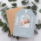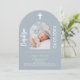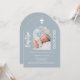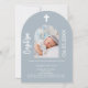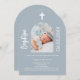 Dusty blauer Hintergrund, mit einem weißen Kreuz dekoriert Personalize und fügen Sie einen Foto Namen und Details. Weißer Text. Bogenförmiger Rahmen aus Foto