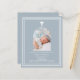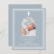 Blauer Hintergrund mit weißem Rahmen und weißem Kreuz Persönlich gestalten und ein Foto mit Details hinzufügen. Weißer Text. Bogenförmiger Rahmen aus Foto 1 Blatt = 1 Einladung mit Druckkante bis Kante.