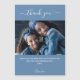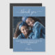 Eine staubige blaue Hintergrundfarbe. Weiß, groß geschrieben Skript mit Swashes und den Text: Danke. Personalisieren und fügen Sie Ihr Foto, danke Ihnen Notiz und Name.