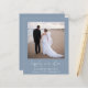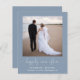 Günstige, staubblaue Entdeckung oder private Hochzeitsankündigung und Einladung zum Empfang mit Ihrem Foto, "glücklich immer nachher" in einem schicken, weißen Kalligrafiebeschreiben mit Swashes und Ihren Vornamen, Hochzeitsdatum und Ort. Auf der Rückseite, anpassen Sie Ihre Ankündigung und Empfang oder Party Einladung, geben Sie Ihre Website-Adresse Ihrer Hochzeit URL-Adresse, um einen QR-Code für Gäste zu scannen, um Ihre Hochzeit Fotos, alle Einzelheiten und UAWG online und unterschreiben Sie Ihre verheirateten Namen in einem signaturähnlichen Skript.