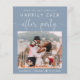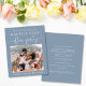 Eine preisgünstige, staubblaue Ankündigung Datum freihalten für einen Hochzeitsempfang nach Ihrer Entstehung oder einer kleinen privaten Hochzeit. Die Vorderseite zeigt Ihr Hochzeitstag Foto und "Save the Date für Unser glückliches Ever After Party" in einer Mischung aus schlichter weißer Typografie und einem schicken weißen Drehbuch mit Wimpern. Fügen Sie unter Ihrem Foto Ihre Vornamen und das Datum des Empfangs ein. Auf der Rückseite personalisieren Sie Ihre Nachricht und fügen das Party oder den Empfang Save the Date Details und Ihre Namen in einem signaturähnlichen Skript hinzu.