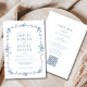 Dieses elegante All-in-One-Hotel mit Viktorianisch inspirierter Atmosphäre empfängt Sie mit einer Vintagen französischen Ästhetik in einer zeitlosen blauen Palette. Das elegante Monogramm und der eingebaute QR-Code vereinen klassischen Charme und modernen Komfort für eine wirklich anspruchsvolle Hochzeitsankündigung.