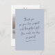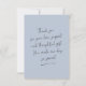 Eine besondere Botschaft der Liebe und des Dankes an Ihre Gäste. Enthält eine handgeschriebene Nachricht im Skriptstil auf staubblauem Hintergrund. Der Rücken wird mit Ihrem Foto, Stimmung, Name und Datum hervorgehoben.