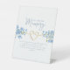 Elegantes, schlichtes, bezauberndes, blühendes, staubblaues Hochzeitsschild mit personalisiertem Tafelpodestal mit wunderschönen Wildblumen, goldenem Seilherz und moderner Kalligraphie-Schrift. In liebender Erinnerung.