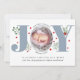 Dusty blue Joy mit Beeren Erstes Weihnachtsfest Foto Holiday Baby Geburt Ankündigung. Es zeigt das Wort "JOY" mit roten Beeren und Grün, während anstelle des Buchstabens "O" Ihr Foto steht. Auf der Rückseite befinden sich staubige blaue Polka-Punkte.