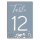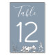Delikate, handgezeichnete Wiesen-Blume in weißer und weicher Holzkohle auf staubblauem Hintergrund, Hochzeitskarten für Tischnummern. Anpassen von Stil, Farbe und Schriftart des Textes. Entworfen, um unsere Dusty Blue Meadow Collection zu ergänzen.
