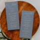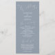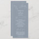 Minimales Hochzeitsprogramm mit modernem Script-Schriftart auf staubblauem Hintergrund. Alle Informationen über die Hochzeitsfeier und den Namen der Hochzeitsfeier auf diesem Programm aufgeführt.