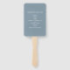 Behalt deinen Gästen cool und informiert mit diesem eleganten, staubblauen Hochzeitshandfan. Mit einem minimalistischen Design und moderner Typografie bietet dieser Handventilator eine raffinierte und praktische Touch für Ihre Hochzeitsfeier. Die weiche Farbe und das saubere Layout zeigen Ihre Details des Hochzeitsprogramms in einem stilvollen und leicht lesbaren Format. Diese Fans sind perfekt für jedes Hochzeitthema geeignet und sorgen dafür, dass Ihre Gäste sich bei der Begleitung Ihrer besonderen Tagesveranstaltungen wohl bleibe fühlen.