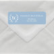 Dusty blue colored background. Decorated with a white wreath. Personalize and add your name, address and family monogram initial. White colored text.