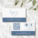 Dusty Blue Monogram Wreath mit Slogan Business Card.. An der Vorderseite unserer einzigartigen Visitenkarte befindet sich ein eleganter botanischer Kranz, der an Ihre zwei Monogramm-Initialen in staubblauer Tinte auf weißem Hintergrund grenzt. Ihr Name und Ihr Titel (oder Firmenname) erscheinen in weißer Tinte auf einem staubblauen Rechteck am Ende der Visitenkarte, was eine maßgebliche Struktur ergibt, um den empfindlichen grünen Kranz auszugleichen. Auf der Rückseite der Karte befinden sich Ihre Telefonnummer, Kontaktdaten der sozialen Medien, Website-Adresse und QR-Code, der auf zusätzliche Informationen verlinkt. Der staubige blaue Abschnitt unten enthält Ihr Geschäftsmotto oder Ihre Tagline. Beispieltext zeigt derzeit "Immer die hohe Straße nehmen" in der Typografie weißer Schriften. Wenn Sie es vorziehen, können Sie den Text für das Motto löschen. Der gesamte Text und der QR-Code können auf der Personalisierungsvorlage leicht überarbeitet werden.