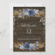 "Dusty Blue Navy Floral Rustic Lights Tischnummer." Navy, staubblaue und blass pastellblaue, florale Aquarellfarbe mit rustikalem Stallholz und glänzenden Märchenleuchten sind eine einladende Suite für eine warme und einladende Familie und Freunde Hochzeit. Handgemalte Aquarellherbstöne mit abgestuftem Blattwerk und farbenfroher Blumengestaltung mit Chrysanthemen, Rose und wilden Blume mit verschiedenen neutralen Erdtönen- und Blattelementen. Wasserfarben-Kunstwerk, erstellt von Audrey Jeanne Roberts, international anerkannter und lizenzierter Künstlerin, Copyright.