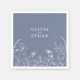 Diese Hochzeitsserviette zeigt weiße Zeichnungen von Wildblumen auf einem staubblauen Hintergrund. Das Hotel ist Teil einer wunderschönen Hochzeitssuite mit Einladung, Speisekarte, Tischnummern und anderen wichtigen Hochzeitsartikeln.