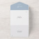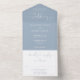 Alles in einer Hochzeitseinladung mit eleganten Herz-Schrift-Typografie und Monogramm-Initialen auf staubblauem Hintergrund. Die Einladung enthält eine perforierte RSVP-Karte, die für Sie individuell adressiert oder links als leere Adresse für die Handschrift der Adressdaten Ihres Gastes verwendet werden kann. Entwickelt von Thisisnotme©