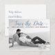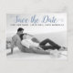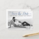 Moderne staubblaue Skripthochzeit Speichern Sie das Date Foto Postcard. Dieses zeitgenössische Typografie Save the Date Design zeichnet sich durch ein Schwarz-Weiß-Foto des Ehepaares und den Text "Save the Date" in einem modernen Script-Schriftart aus.