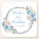 Beautiful birthday party coaster with a dusty blue and silver faux glitter frame with floral flower arrangements. Perfect for a birthday party. The words can be changed to suit your own details or requirements