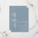 Diese dustig blaue Save the Date-Karte verfügt über einen modernen Script-Schriftart, der eine Touch zeitloser Eleganz verleiht. Das minimalistische Design behalte den Fokus auf Ihre Namen und Ihr Hochzeitstermin, was eine klare und stilvolle Aussage macht. Diese Karte ist perfekt für jede Jahreszeit und ergänzt eine Vielzahl von Hochzeitsthemen, von romantisch und elegant bis modern und raffiniert. Personalisieren Sie es mit Ihren Namen und Hochzeitsdatum für einen rett-the-Date, der Ihren einzigartigen Stil widerspiegelt.