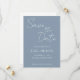 Einfache Hochzeit im Stile rette den aktuellen Einladungen, die mit einem weißen, stilisierten Skript auf einem trendigen, staubblauen Hintergrund versehen sind. Bearbeiten und ersetzen Sie Namen, Datum und Position mit Ihrem eigenen. Wählen Sie Ihre Einladungsgröße und Ihren Papierstil aus.
