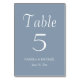 Begleiten Sie Ihre Hochzeitsgäste mit dieser schlichten Tischnummer-Karte, die mit weißen, stilisierten Schriften auf einem trendigen, staubblauen Hintergrund versehen ist. Design ist auf jeder Seite der Karte. Bearbeiten Sie Ihre Karte, um die Tischnummer, die Namen und das Datum des Ehepaares zu ändern. Bestellen Sie Karten für jede Tischnummer separat.