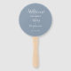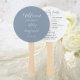 Hochzeitstag-Programm gedruckt auf einem runden Handventilator, der einen trendigen, staubblauen Hintergrund auf der Vorderseite mit Braut- und Bräutigamen in weißem, stilisiertem Schrift aufweist. Auf der Rückseite des Programms sind die Teilnehmer der Hochzeitsfeier und die Zeremonie-Rites auf weißem Hintergrund mit dunkelgrauer Schrift aufgeführt. Bearbeiten Sie den Handventilator und ersetzen Sie die Informationen zum Hochzeitsprogramm durch Ihre eigenen. Ideal für eine Hochzeitsfeier im Innen- oder Außenbereich! Wählen Sie die gewünschte Anzahl von Hand-Lüfterprogrammen aus.