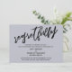 Diese Suite zeichnet sich durch den modernen, handgeschriebenen Script-Schriftart aus, der für Akzente verwendet wird. Falls Sie Ihren Gästen gelassen werden müssen, dass Ihre Hochzeit abgesagt wurde, bietet diese Karte eine kühne und auffällige Option. In diesem Stück wurde der handgeschriebene Script-Schriftart verwendet, um eine grafische Darstellung des Wortes "bedauerlich" zu erstellen. Verwenden Sie die Vorlagenfelder, um Ihre persönlichen Daten hinzuzufügen und dieses einzigartige, moderne Design zu Ihrem eigenen zu machen. Der Hintergrund kann in eine beliebige Farbe geändert werden. Bitte kontaktieren Sie uns für spezielle Anfragen oder für individuelle Betreuung. // 100 //