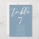 Diese staubblaue Tischnummer verströmt Ruhe für eine Hochzeit an der Küste am Meer. Personalisieren Sie diese hellgraue blaue Karte mit eleganter, minimalistischer Typografie und Ihren Gästen Namen in weiß, um Ihre ruhige Bridal-Farbe.