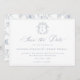 Dusty Blue Monogram Wappen, Hochzeit speichern Sie das Datum. Vintag inspiriert Regency-Era Barocklinie Art Monogramm Wappen. Features, eine elegante dustig blaue Typografie Design Stil Mischung aus Skript und fett-Typ. Chinoiserie Stil Gartenmuster Rückendeckung mit QR Code Detail.