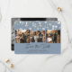 Elegante, staubblaue Hochzeitskarte Save the Date Foto. Unsere Hochzeit speichern das Datum mit einer Foto-Collage von 3 Bildern auf einem staubblauen Hintergrund mit Saitenleuchten auf der Vorderseite und einem Foto auf der Rückseite. Personalisieren Sie diese staubblaue Save the Date-Karte einfach mit Ihren Fotos und Hochzeitsdetails.