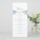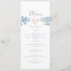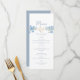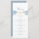Elegante, moderne Kalligraphie-Skripte, elegantes, staubblaues Hochzeitsmenü mit Goldseilherz, periwinkle Wildblumen, Monogramm und einfachem Kalligrafieschreiben.