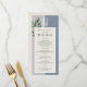 Einfaches, modernes, minimalistisches, botanisches, elegantes Brautmenü mit blauen und dustigen Blautönen und Riesenmonogramm - Initialen oben, Grün und trendige Kalligraphie-Schrift.