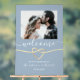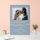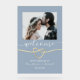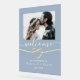 Herzlich willkommen in unserem minimalistisch dustig blauen Acryl Hochzeitszeichen. Mit einem Foto des Ehepaares, einem romantischen Goldrachenherz und einer angesagten handgeschriebenen Schrift verkörpert es moderne Eleganz und persönlichen Charme.