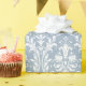 Eine staubige blau-weiße Damast Hochzeitsverpackung mit dem Namen der Braut und des Bräutigams und dem numerischen Hochzeitstag mit Glückwunsch auf der Verpackung Papier.