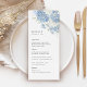 Dusty Blue & White floral wedding reception dinner menu featuring watercolor hydrangea blooms. A modern classic menu card for your place settings and tablescape—perfect for garden, coastal, and elegant ballroom weddings. Personalize the text to match your courses and serving style, then print or display at the reception.