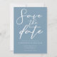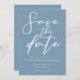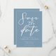 Diese staubige blaue Save the Date-Karte verströmt Ruhe für eine Hochzeit an der Küste im Sommer. Diese hellgrauen Blautöne laden mit eleganter minimalistischer Typografie zu einer gelungenen Bräunungsfarbe ein.