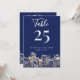 Diese Dusty Blue Watercolor Wildblumen Elegant Script Navy Wedding 5 x 7 Tischnummer präsentiert zarte Aquarellfarben-Wildblumen in staubblauer, lila und gelber Farbe auf marineblarem Hintergrund, ergänzt durch zeitgenössische Typografie und Skriptkalligraphie in Weiß. Das formelle Design und die Formulierung fügen Ihrer Hochzeitsfeier eine Touch der Eleganz hinzu. Alle meine Designs können auf jedes Produkt übertragen werden, das Zazzle trägt. Für spezielle Wünsche oder Anfragen, senden Sie mir einfach eine Nachricht. Für Anfragen, Rücksendungen und Austausche wenden Sie sich bitte an den Zazzle Kundenservice unter https://www.zazzle.com/about/ask. ©PoppyMeadowDesigns 2023-2025