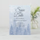 Ein "Save the Date" mit einer traumhaften Winterlandschaft aus schwindenden Kiefern und Schneeflocken in schönen Duschblau-Tönen. Erleben Sie die herrliche, verschneite Landschaft und lassen Sie sich von Ihren Gästen verzaubern. Auch die passende Hochzeitseinladung und andere notwendige Hochzeiten sind verfügbar.