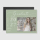 Ja! Ihre Mittelschule, High School, Uni/Uni, Techschule oder Studentin des Graduiertenstudiums hat es geschafft und ist geschlossen! Feiern Sie einen wertvollen Augenblick ihres Lebens und senden Sie diesen Abschluss Ankündigung Magnetkarte. Der Magnet zeichnet sich durch einen schlichten, modernen minimalistischen Stil aus, mit einer schönen Kalligraphie-Schrift auf einem staubigen grünen Hintergrund und dem Foto des Absolventen. Passen Sie den Text und die Fotos einfach in der Personalisierungsbox an und ersetzen Sie ihn. Bitte beachten Sie: Die eleganten Kalligraphieskripte-Formulierungen "graduate" zusammen mit den Zeilen und anderen grafischen Werken und Elementen können nicht bearbeitet, gelöscht oder verschoben werden. Sie sind repariert.
