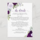 Diese schöne Einschließungskarte dient dazu, Ihren Gästen zusätzliche Informationen über den Empfang, die Unterkünfte, die Reisearrangements, die Registrierung, die Website, die Anfahrtsbeschreibung und alle anderen Einzelheiten zu liefern, die Ihre Gäste benötigen könnten. Das rustikale boho-schicke Design mit laky-Script-Kalligraphie und handgemalten Aquarellfarben-Rose in kräftigen lila-, Lavendel-, Pflaumen- und Violetttönen.