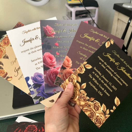Extrem schlechte Qualität. Wird nicht auf einem schwarzen Papier gedruckt. Die Ränder sind weiß. Das schwarz ist eher bräunlich. Wenn man über das Papier feucht drüber wischt verfärbt sich die Stelle. Ich muss sie vernichten denn solche Einladungen kann ich nicht verschicken. .