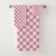 Pink and white checkerboard pattern with evenly spaced squares. The design is simple, creating a playful and retro feel.