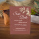 Diese Dusty Rose Herbst Boho Hochzeit speichern Sie das Datum kombiniert ein antikes Flair mit einem Retro-böhmischen Wildblume-Look. Die eleganten, beigen Wildblumen auf der staubigen Rose, der mauve Hintergrund mit der klassischen Kalligraphie-Typografie, ermöglichen eine formale, aber wilde und blumengeschmückte Hochzeitsfeier im Vintagen Stil.