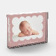 Einfache und moderne Geburtsankündigung Foto-Block mit dem Foto Ihres Babys in einem staubigen Rose-Skallopierrahmen eingebettet. Personalisieren Sie den Foto-Block, indem Sie den Namen Ihres Babys und zusätzliche Informationen in weißer Schrift hinzufügen.