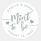 Die Punny Gastgeschenk Hochzeit Aufkleber sind in einem staubigen, grün geschriebenen Schriftsatz mit Herzenskenntnis "mint to be". Personalisieren Sie mit Ihren Namen und Hochzeitstermin.